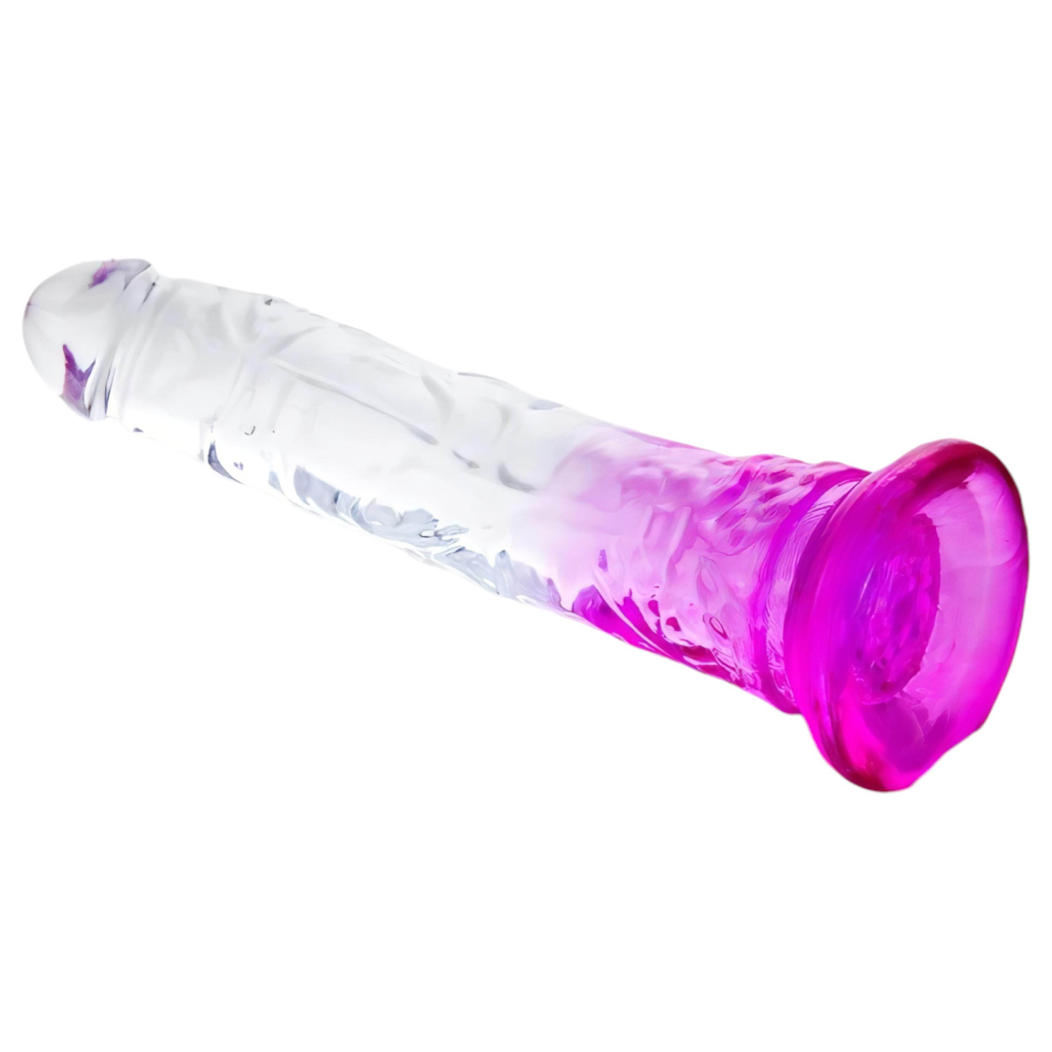 • Kleur: vanaf de eikel tot halverwege de dildo transparant, richting zuignap paars